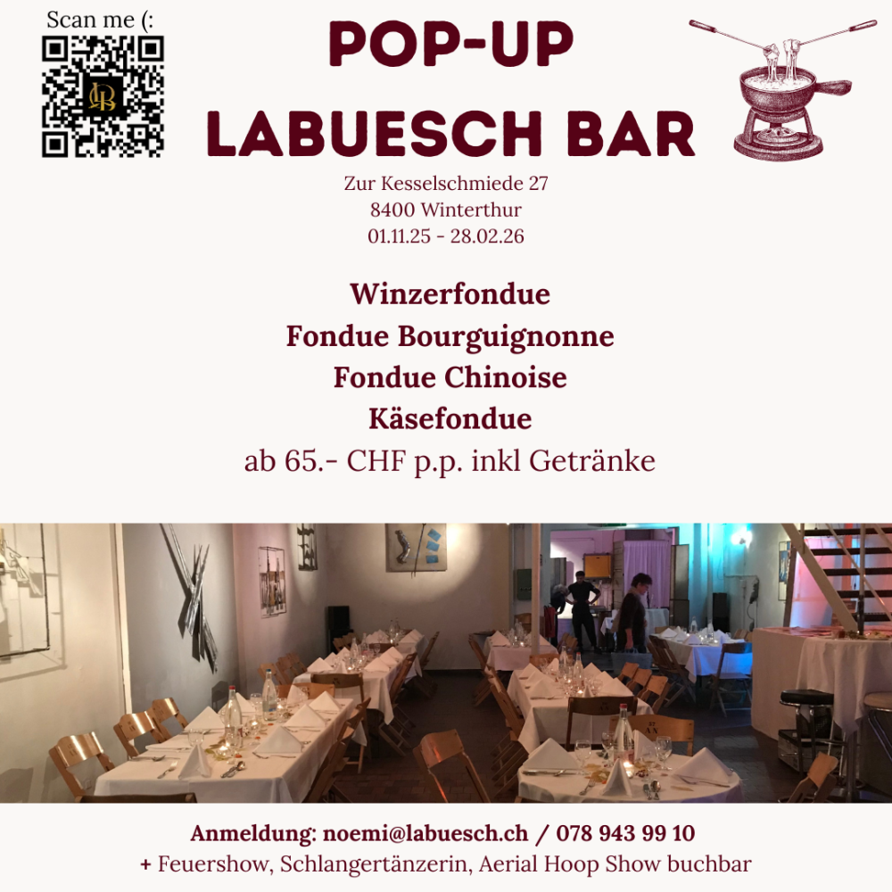 Ich heisse dich willkommen in der Labuesch Bar in Witherthur. Hier trifft Industriegeschichte auf kreatives Stadtleben. Unsere Bar ist mehr als nur ein Drink und vier Wände. Du feierst inmitten einer historischen Fabrikhalle mit echtem industriellem Charme, umgeben von funkelnden Eisenkunstwerken und einem Hauch von Kultur in der Luft. Ob du auf einen selbstgemachten Cocktail vorbeikommst, ein Open Mic geniessen willst oder den perfekten Ort für deine nächste Feier suchst, bei uns bist du goldrichtig. Drinnen erwartet dich ein imposanter Saal mit Bühne, draussen ein gemütlicher Innenhof. Es ist somit viel Platz für grosse Ideen und unvergessliche Abende. Die Labuesch Bar ist locker, herzlich und etwas verrückt. Es ist ein Treffpunkt für alle, die Authentizität lieben und das Besondere suchen. Komm vorbei und erlebe es selbst: Hier ist jeder Abend ein Kunstwerk!